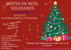 Nous avons organisé, du 24 novembre au 12 décembre 2025, une collecte de boîtes de Noël solidaires en faveur des personnes les plus démunies. Les élèves et les adultes étaient invités à préparer une boîte (boîte à chaussures ou autre) contenant un objet chaud, une gourmandise, un loisir, un produit de beauté ainsi qu’un mot doux. Les boîtes devaient être emballées puis déposées dans le hall du collège.